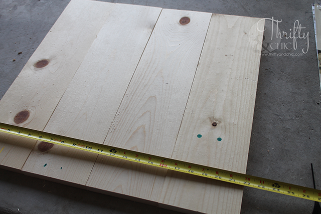 So, next I cut my 1x6's to 22". Four of them equaled my desired 22" wide, so that was perfect! This then measured a square at 22" on each side.